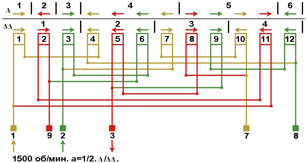 Схема соединений электродвигателей холодильного компрессора с разделёнными обмотками "PW" 1500 об/мин а=1/2, Δ/ΔΔ.