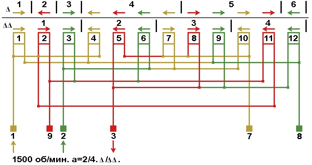 Схема соединений электродвигателей холодильного компрессора с разделёнными обмотками "PW" 1500 об/мин а=2/4, Δ/ΔΔ.