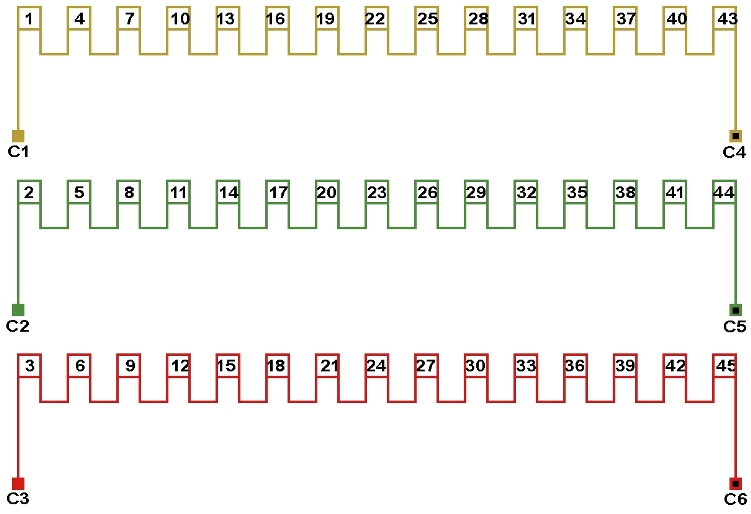 Схема соединений однослойной обмотки электродвигателя 200 об/мин. 2p=30, количество параллельных ветвей: а=1.
