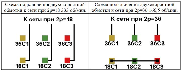 Схемы соединений и подключения двухскоростных обмоток. 166,5/333 об/мин. 2p=36/18.