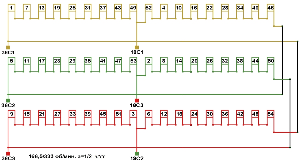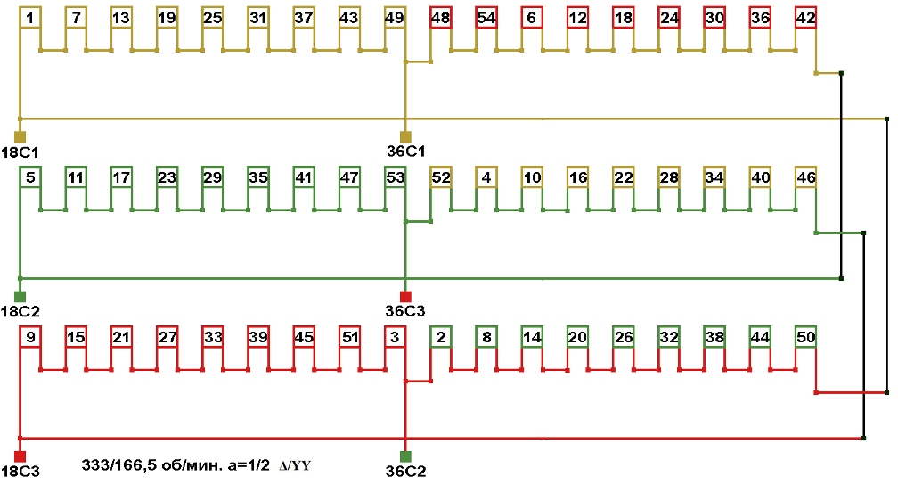 Схемы соединений обмоток двухскоростных электродвигателей 333/166,5 об/мин. 2p=18/36, а=1/2, соединение фаз Δ/YY.