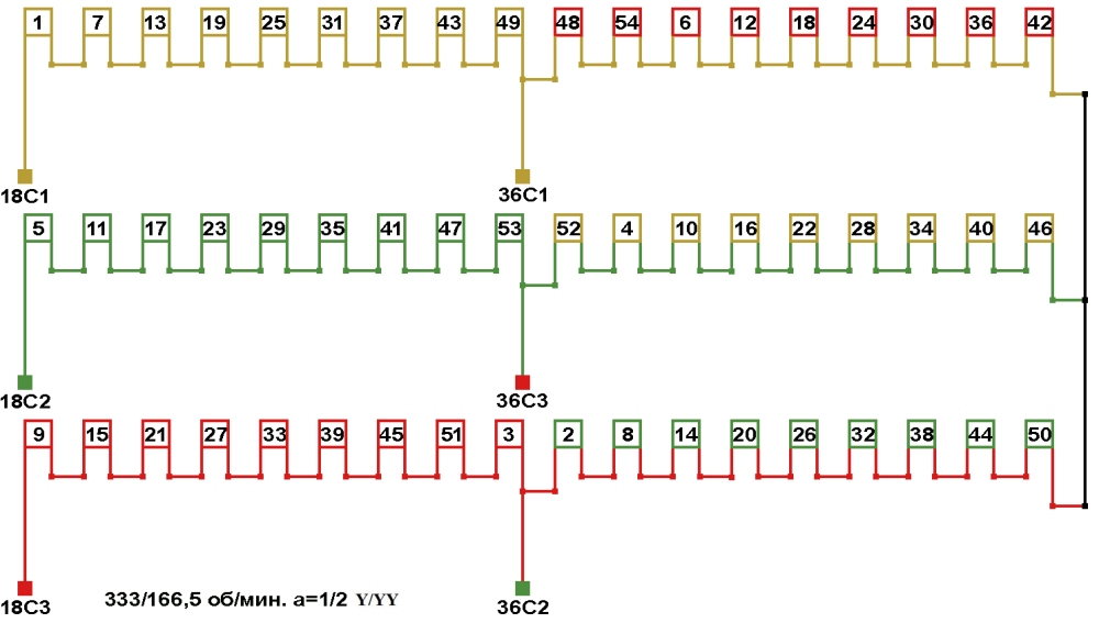 Схемы соединений обмоток двухскоростных электродвигателей 333/166,5 об/мин. 2p=18/36, а=1/2, соединение фаз Y/YY.