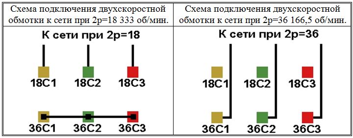 Схемы соединений и подключения двухскоростных обмоток. 333/166,5 об/мин. 2p=18/36.