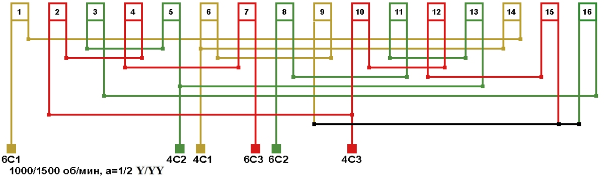 Схема соединений двухскоростной обмотки. 2p=6/4, 1000/1500 об/мин., а=1/2, соединение фаз Y/YY.