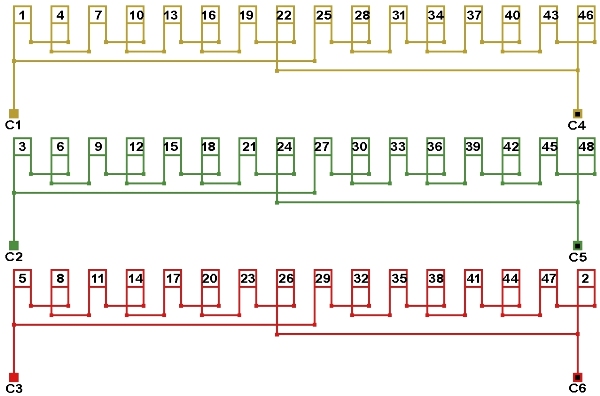 Схема соединений двухслойной обмотки электродвигателя 375 об/мин. 2p=16, количество параллельных ветвей: а=2.