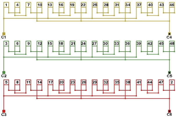 Схема соединений двухслойной обмотки электродвигателя 375 об/мин. 2p=16, количество параллельных ветвей: а=4.