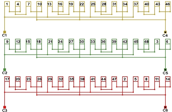 Схема соединений двухслойной обмотки электродвигателя 375 об. мин. 2p=16, количество параллельных ветвей: а=4.