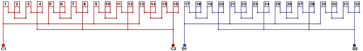 Схема соединений однофазной обмотки, количество параллельных ветвей а=4.