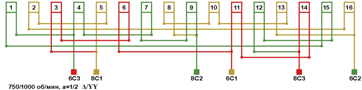 Схема соединений двухскоростной обмотки. 2p=8/6, 750/1000 об/мин., а=1/2, соединение фаз Δ/YY.