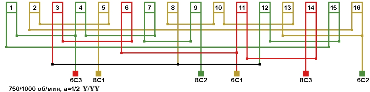 Схема соединений двухскоростной обмотки. 2p=8/6, 750/1000 об/мин., а=1/2, соединение фаз Y/YY.