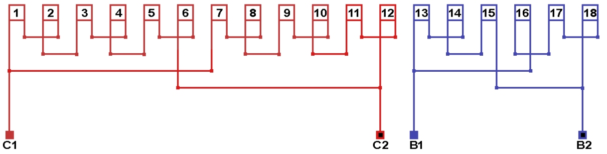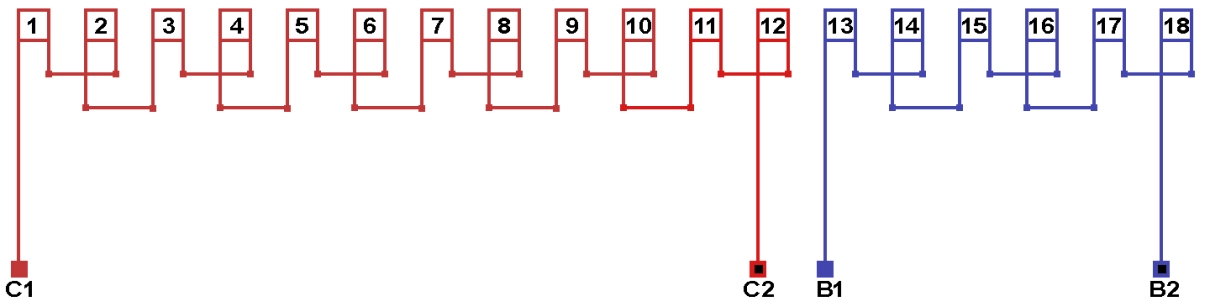 Схема соединений однофазной обмотки, количество параллельных ветвей а=2.