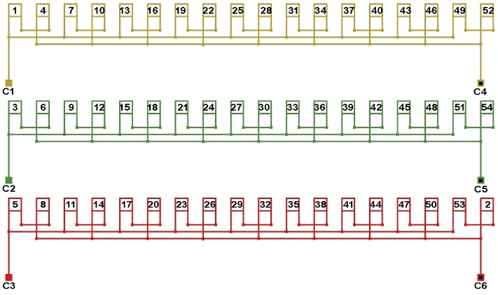 Схема соединений двухслойной обмотки электродвигателя 333 об/мин. 2p=18, количество параллельных ветвей: а=9.