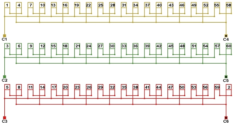 Схема соединений двухслойной обмотки электродвигателя 300 об/мин. 2p=20, количество параллельных ветвей: а=10.