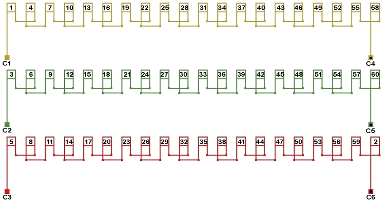 Схема соединений двухслойной обмотки электродвигателя 300 об/мин. 2p=20, количество параллельных ветвей: а=1.