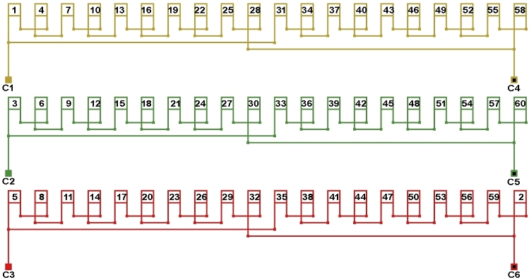 Схема соединений двухслойной обмотки электродвигателя 300 об/мин. 2p=20, количество параллельных ветвей: а=2.