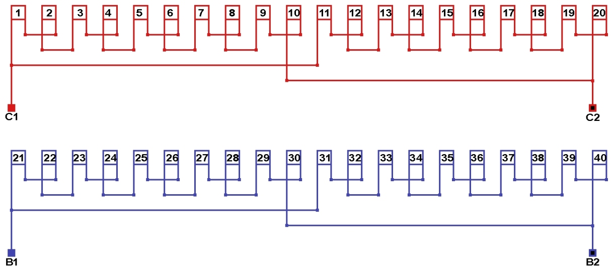 Схема соединений однофазной обмотки, количество параллельных ветвей а=2.