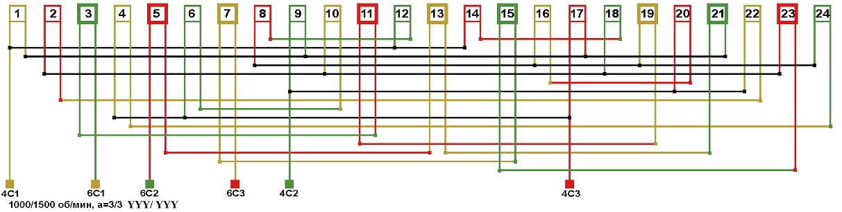 Схема соединений двухскоростной обмотки. 2p=6/4, 1000/1500 об/мин., а=3, соединение фаз YYY/YYY.