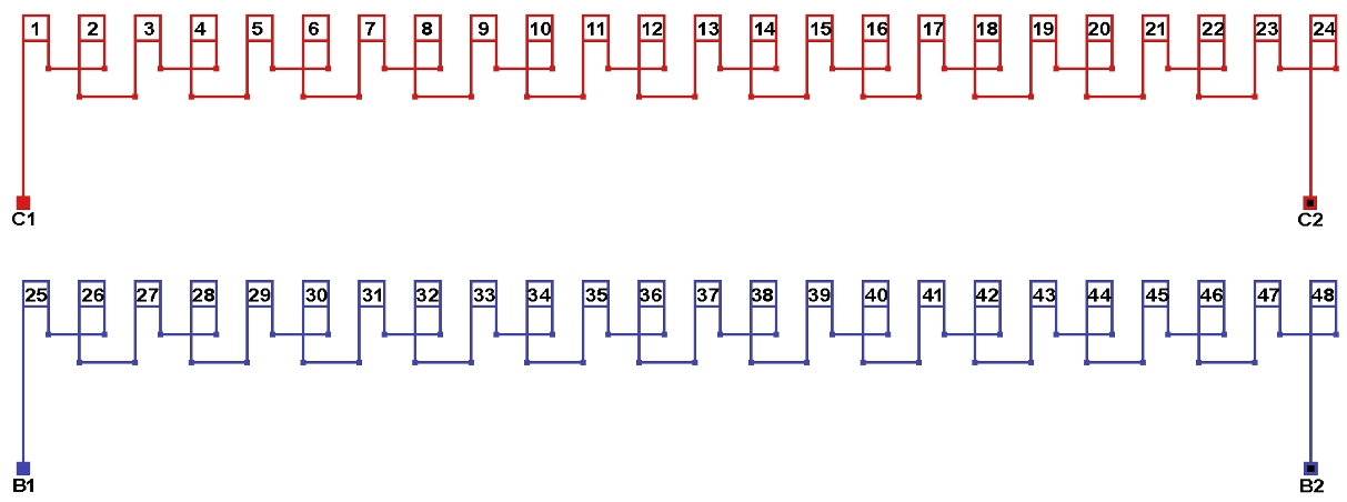 Схемы соединений и подключения обмоток однофазных электродвигателей 250 об/мин. 2p=24, количество параллельных ветвей: а=1.