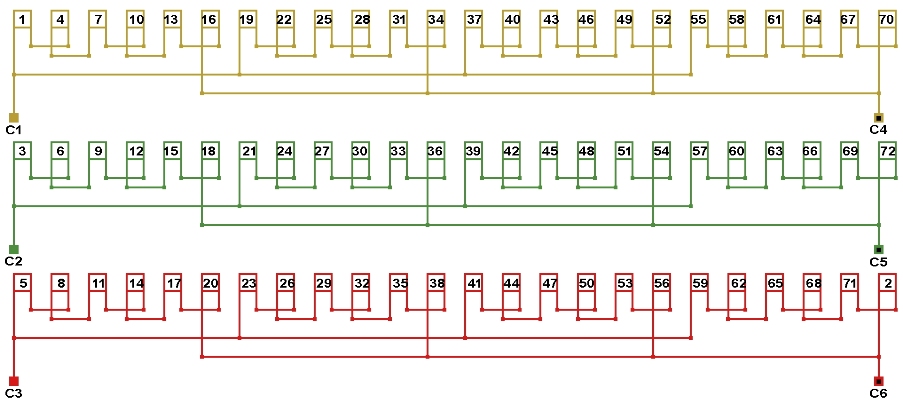 Схема соединений двухслойной обмотки электродвигателя 250 об/мин. 2p=24, количество параллельных ветвей: а=4.