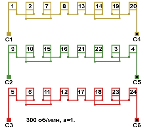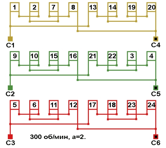 Схема соединений обмотки электродвигателя 300 об/мин. 2p=20.