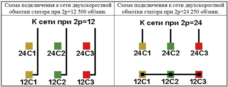 Схемы соединений и подключения двухскоростных обмоток. 500/250 об/мин. 2p=12/24.