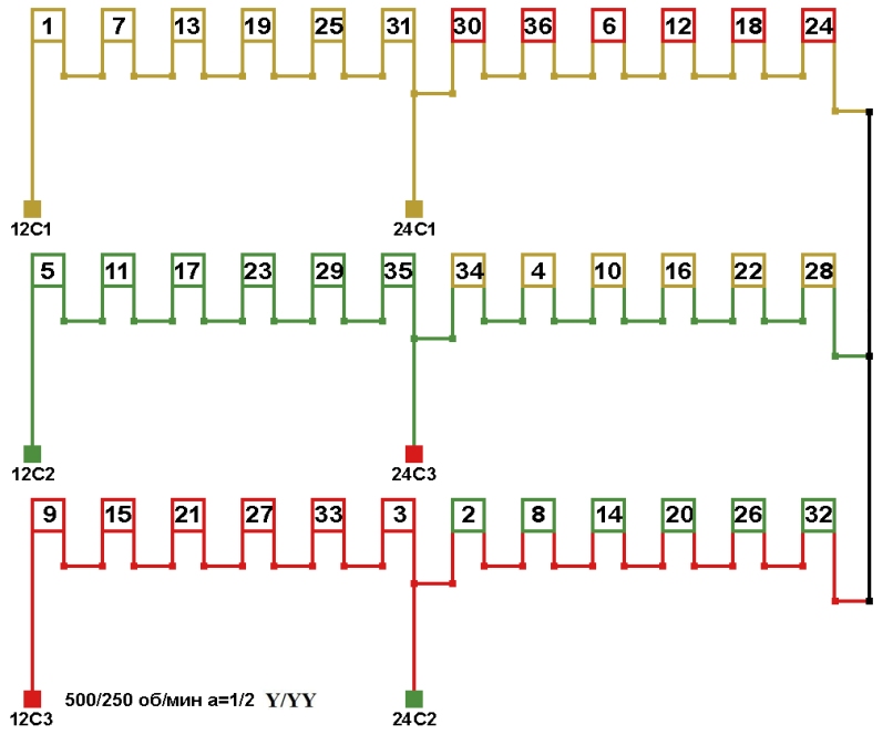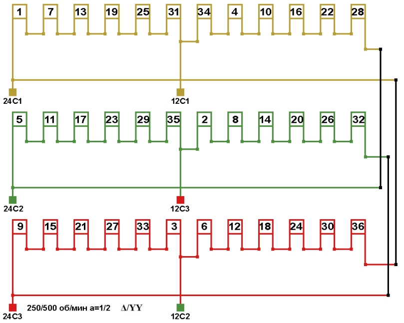Схема соединений двухскоростной обмотки. 500/250 об/мин. 2p=12/24., а=1/2, соединение фаз Y/YY.
