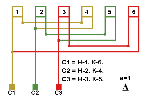 Схема соединений обмотки 1500 об/мин. в треугольник, количество параллельных ветвей: а=1.