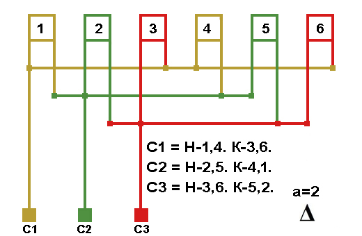 Схема соединений обмотки 1500 об/мин. в треугольник, количество параллельных ветвей: а=2.