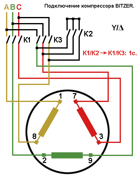 Схемы подключения обмоток электродвигателей холодильного компрессора 3000 об/мин, Y/Δ.