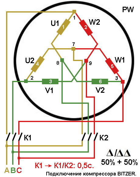 Схема подключения электродвигателей холодильного компрессора с разделёнными обмотками "PW" 3000 об/мин, Δ/ΔΔ.