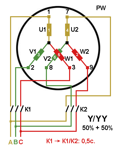 Пуск двигателя с разделёнными обмотками "PW" Y/YY.