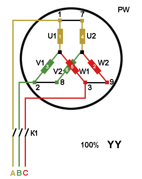Схема соединений электродвигателей холодильного компрессора с разделёнными обмотками "PW" 3000 об/мин, Y/YY.