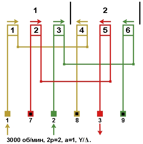 Схема соединений обмотки, количество параллельных ветвей а=1, Y/Δ.