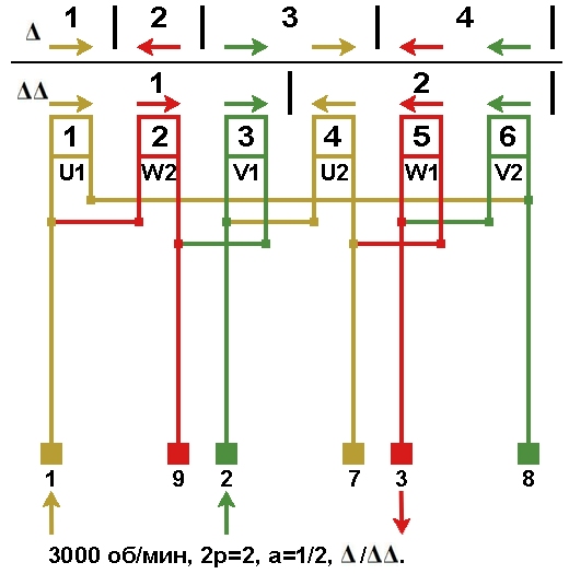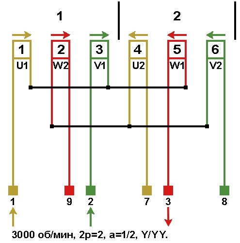 Схемы соединений и подключения обмоток электродвигателей холодильного компрессора 3000 об/мин, Y/Δ, Δ/ΔΔ, Y/YY.