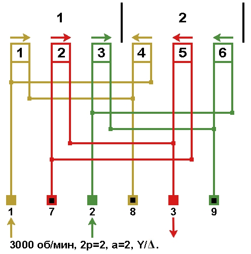 Схема соединений обмотки, количество параллельных ветвей а=2, Y/Δ.