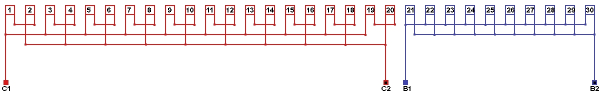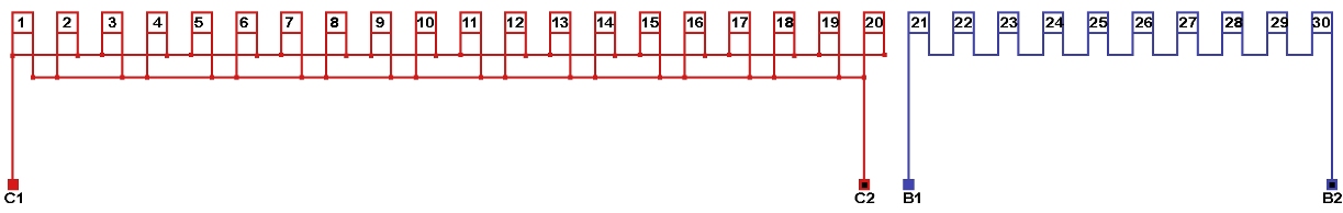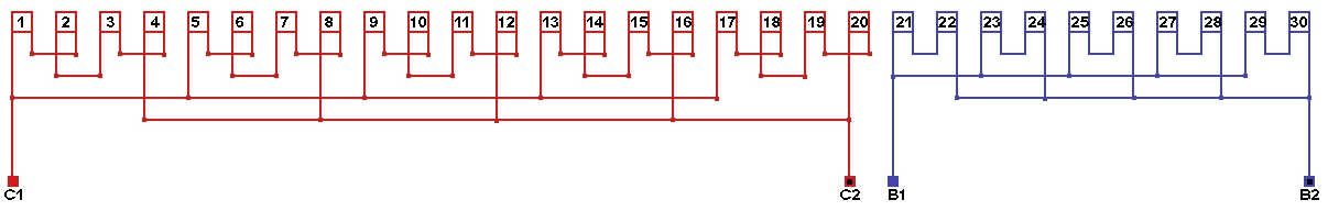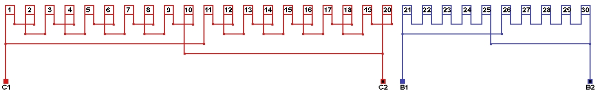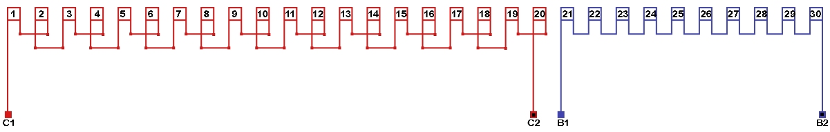 Схема соединений однофазной обмотки, количество параллельных ветвей в рабочей обмотке а=20, в пусковой обмотке а=1.