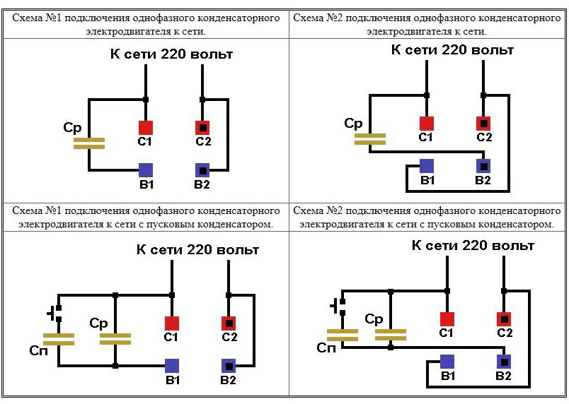 Схемы подключения однофазного электродвигателя к сети.