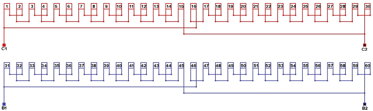 Схемы соединений и подключения обмоток однофазных электродвигателей 200 об/мин. 2p=30, количество параллельных ветвей: а=2.