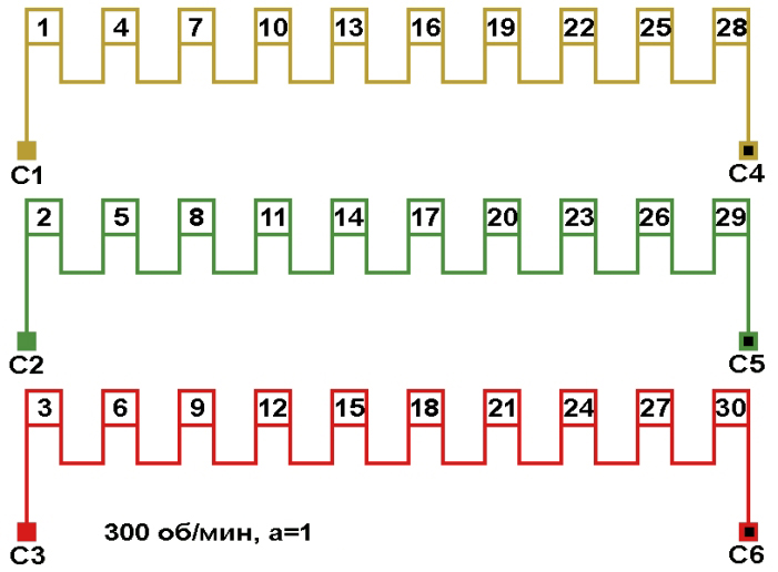 Схема соединений обмотки электродвигателя 300 об/мин. 2p=20, количество параллельных ветвей: а=1.