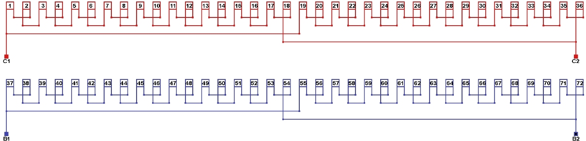 Схема соединений однофазной обмотки, количество параллельных ветвей а=2.