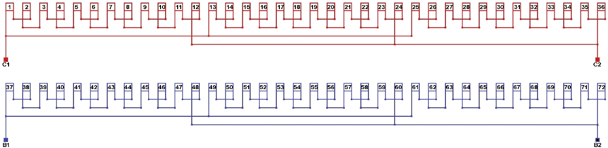 Схемы соединений и подключения обмоток однофазных электродвигателей 166,6 об/мин. 2p=36, количество параллельных ветвей: а=3.
