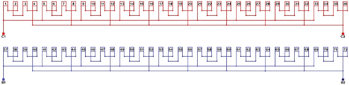 Схема соединений однофазной обмотки, количество параллельных ветвей а=9.
