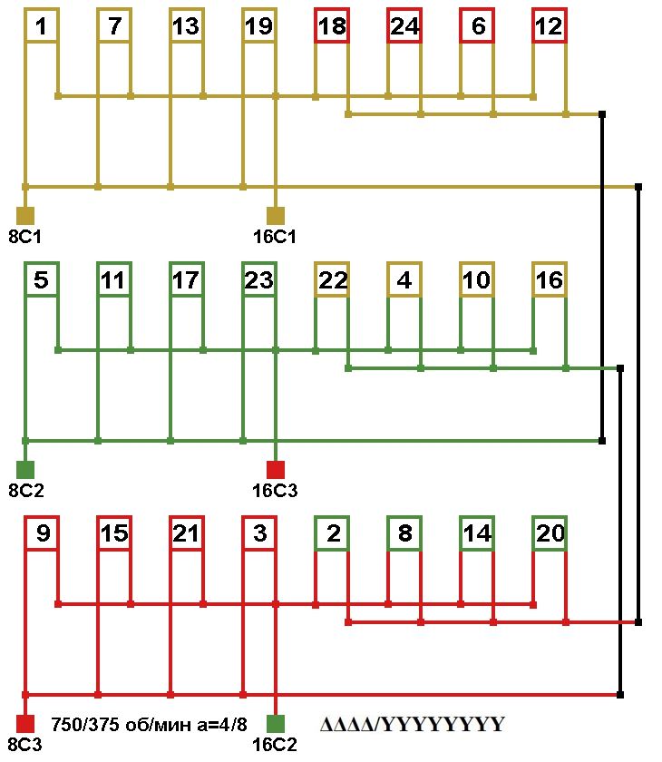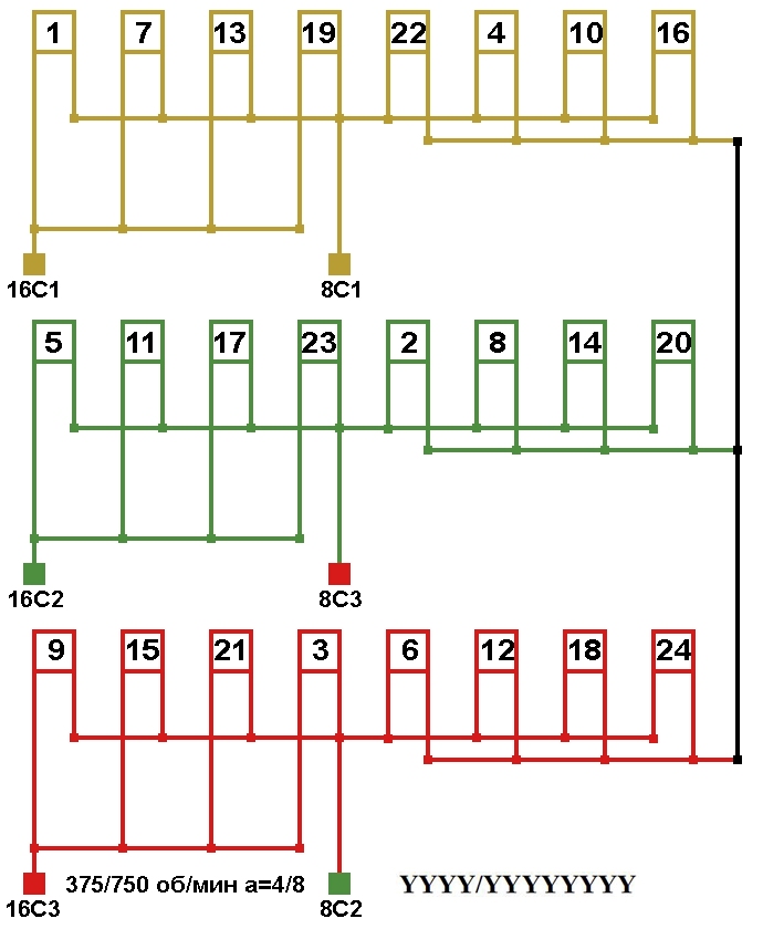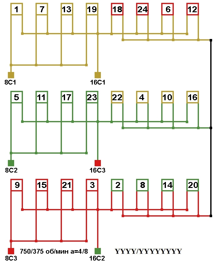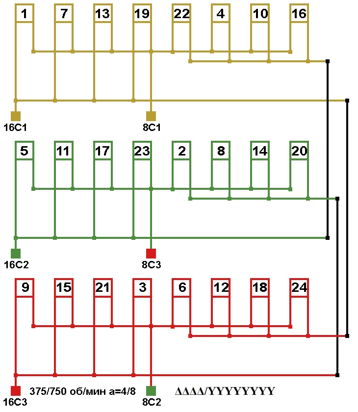 Схема соединений двухскоростной обмотки. 2p=8/16, 750/375 об/мин., а=4/8, соединение фаз YYYY/YYYYYYYY.