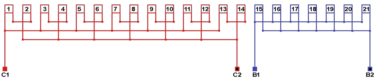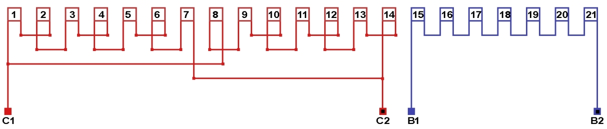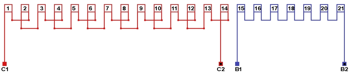 Схема соединений однофазной обмотки, количество параллельных ветвей в рабочей обмотке а=14, в пусковой обмотке а=1.