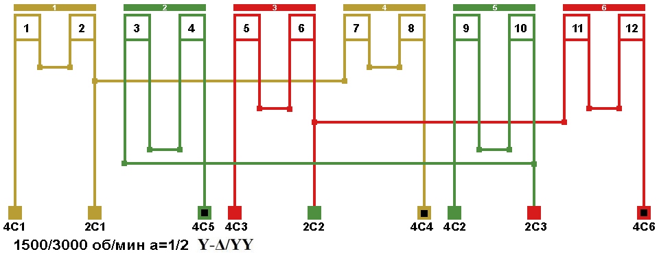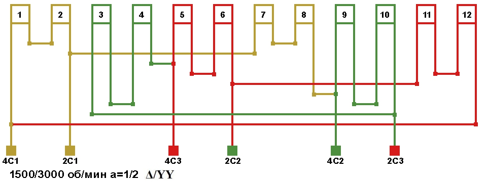 Схема соединений двухскоростной обмотки. 2p=4/2, 1500/3000 об/мин., а=1/2, соединение фаз Δ/YY.