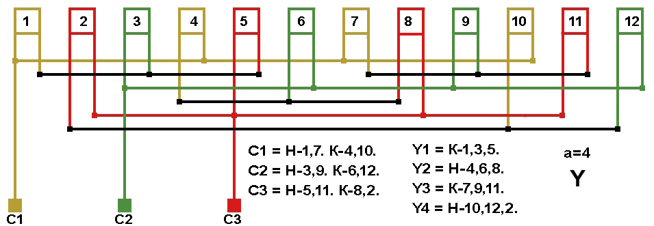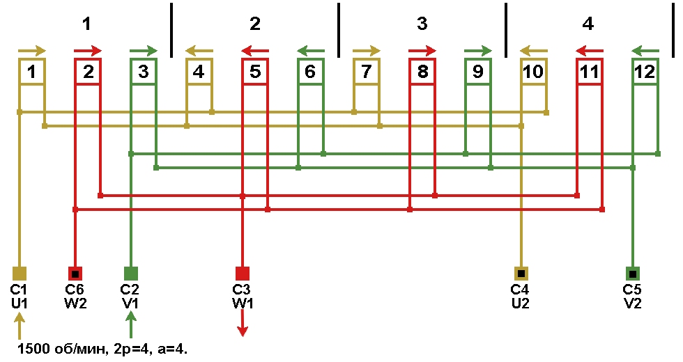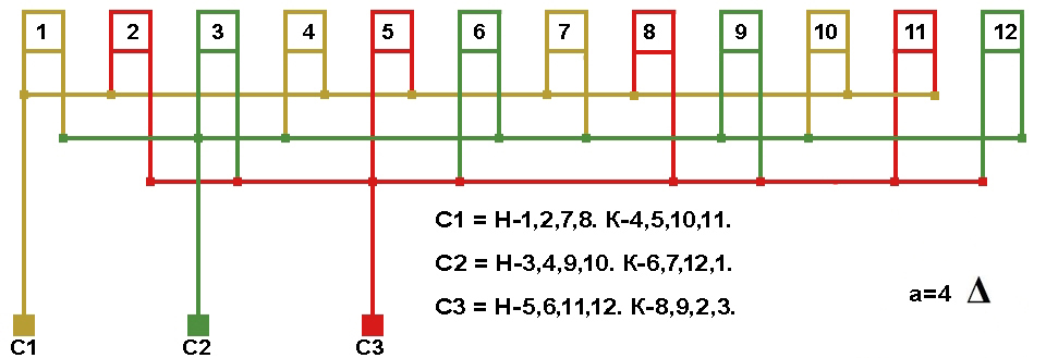 Схема соединений обмотки в треугольник, количество параллельных ветвей а=4.
