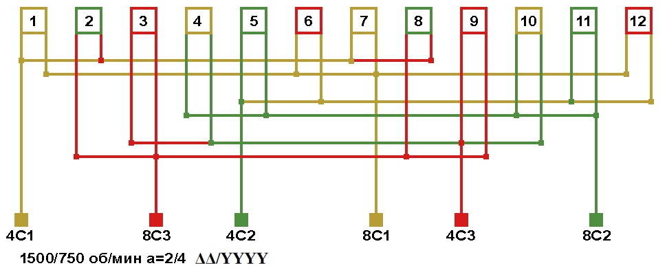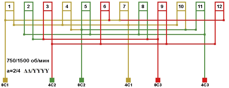 Схема соединений двухскоростной обмотки. 2p=4/8, 1500/750 об/мин., а=2/4, соединение фаз ΔΔ/YYYY.