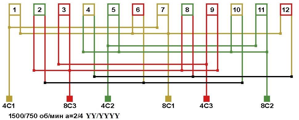 Схема соединений двухскоростной обмотки. 2p=4/8, 1500/750 об/мин., а=2/4, соединение фаз YY/YYYY.
