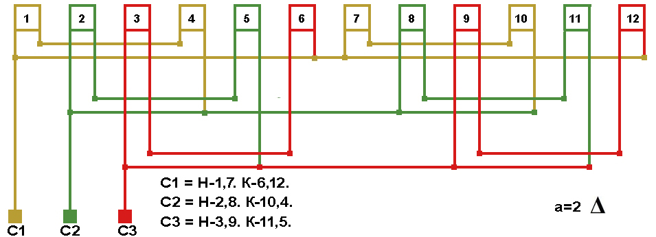 Схема соединений обмотки в треугольник, количество параллельных ветвей а=2.