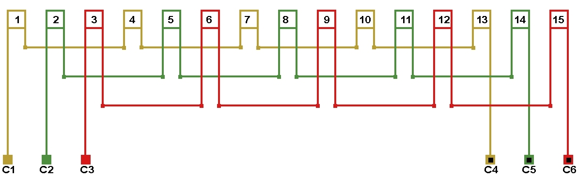Схема соединений однослойной обмотки электродвигателя 600 об/мин. 2p=10, количество параллельных ветвей: а=1.